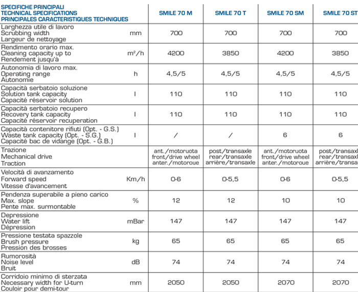 Compatta, manegevole, facile da usare. Adatta a piccole / medie superfici, completamente meccanica. Disponibile nella doppia versione a batteria ed elettrica. Ha una capacità serbatoio raccolta / soluzione di 30 litri e un'autonomia di lavoro di tre ore e trenta minuti (versione a batteria). È indicata per essere utilizzata in ambienti Horeca, pubblico, benessere (palestre, centri fitness e piscine).